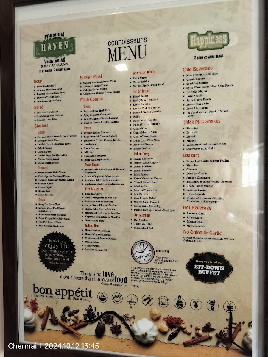 Welcome to Haven Sampoorna, a delightful vegetarian haven tucked away in Velachery, Chennai. This vibrant restaurant offers a culinary journey through a diverse range of cuisines including Indian, Continental, and Thai, appealing to every palate. Patrons rave about the warm ambiance and attentive service that elevate the dining experience.